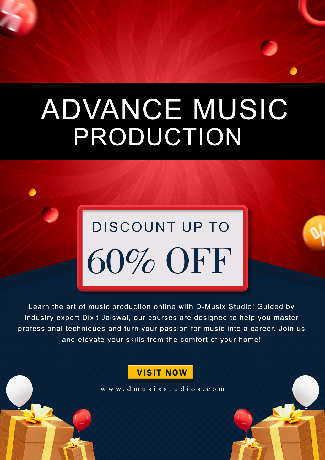 Learn the art of Professional Quality Music Production with D-Musix Studio! Guided by industry expert Dixit Jaiswal, our courses are designed to help you master professional techniques and turn your passion for music into a career. Join us and elevate your skills from the comfort of your home!